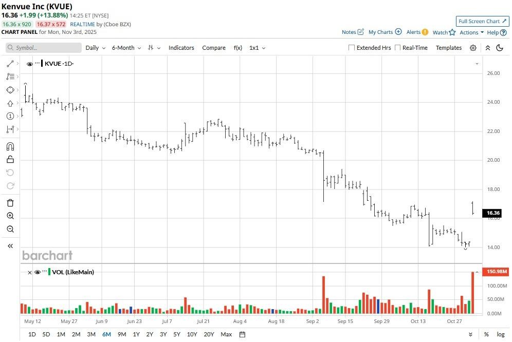 Despite today’s surge, Kenvue stock is down well over 30% versus its year-to-date high set in May.