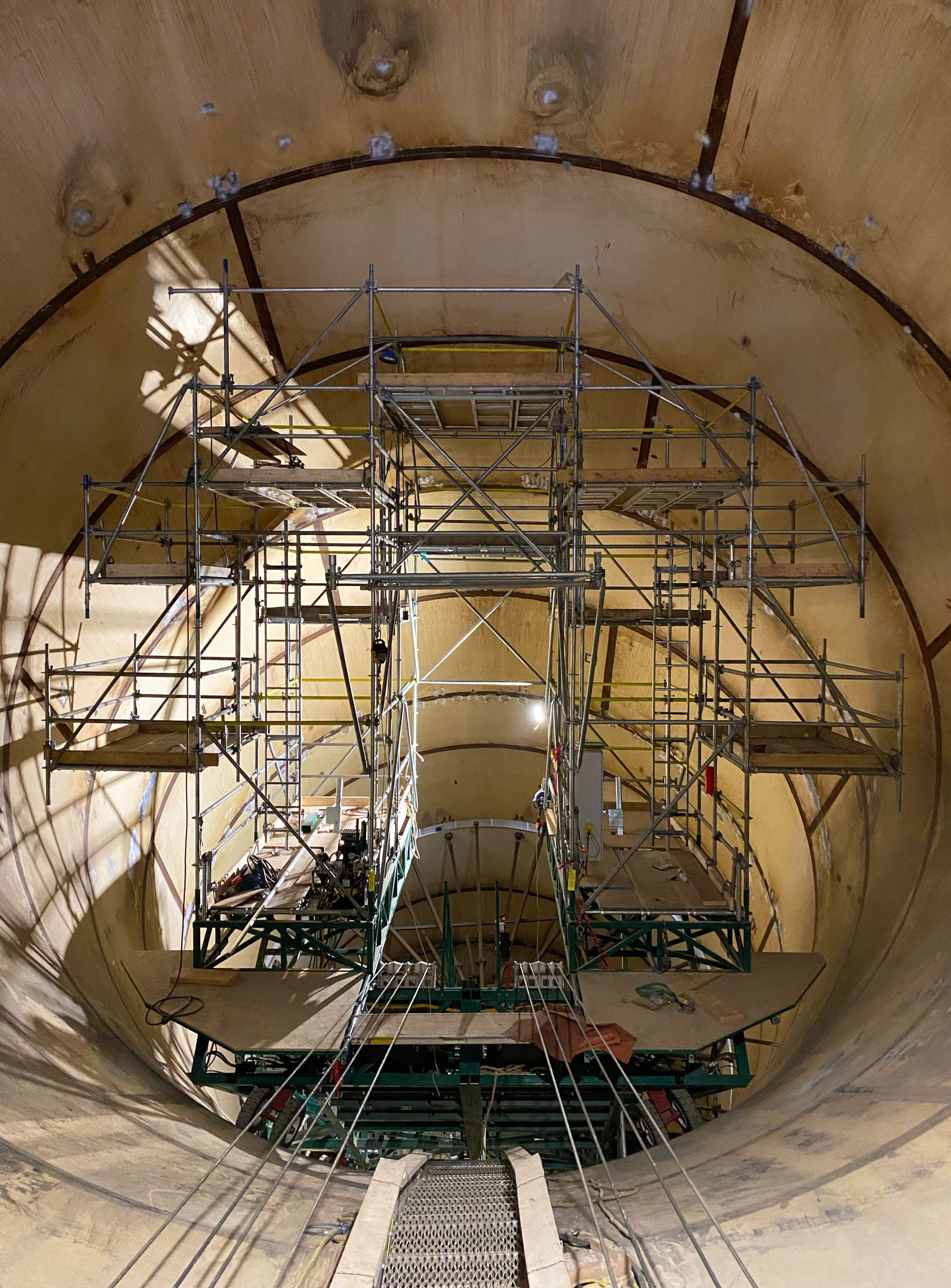 The BC Hydro Site C Clean Energy Project on the Peace River in Fort St. John, British Columbia, features six 183-megawatt hydro turbines. General Contractor Groupe LAR retained BrandSafway to design and deliver a hybrid access/scaffold solution on six penstocks, which are 32 feet in diameter, 300-feet-long fabricated steel conduits, and run from the reservoir above to the turbines below.