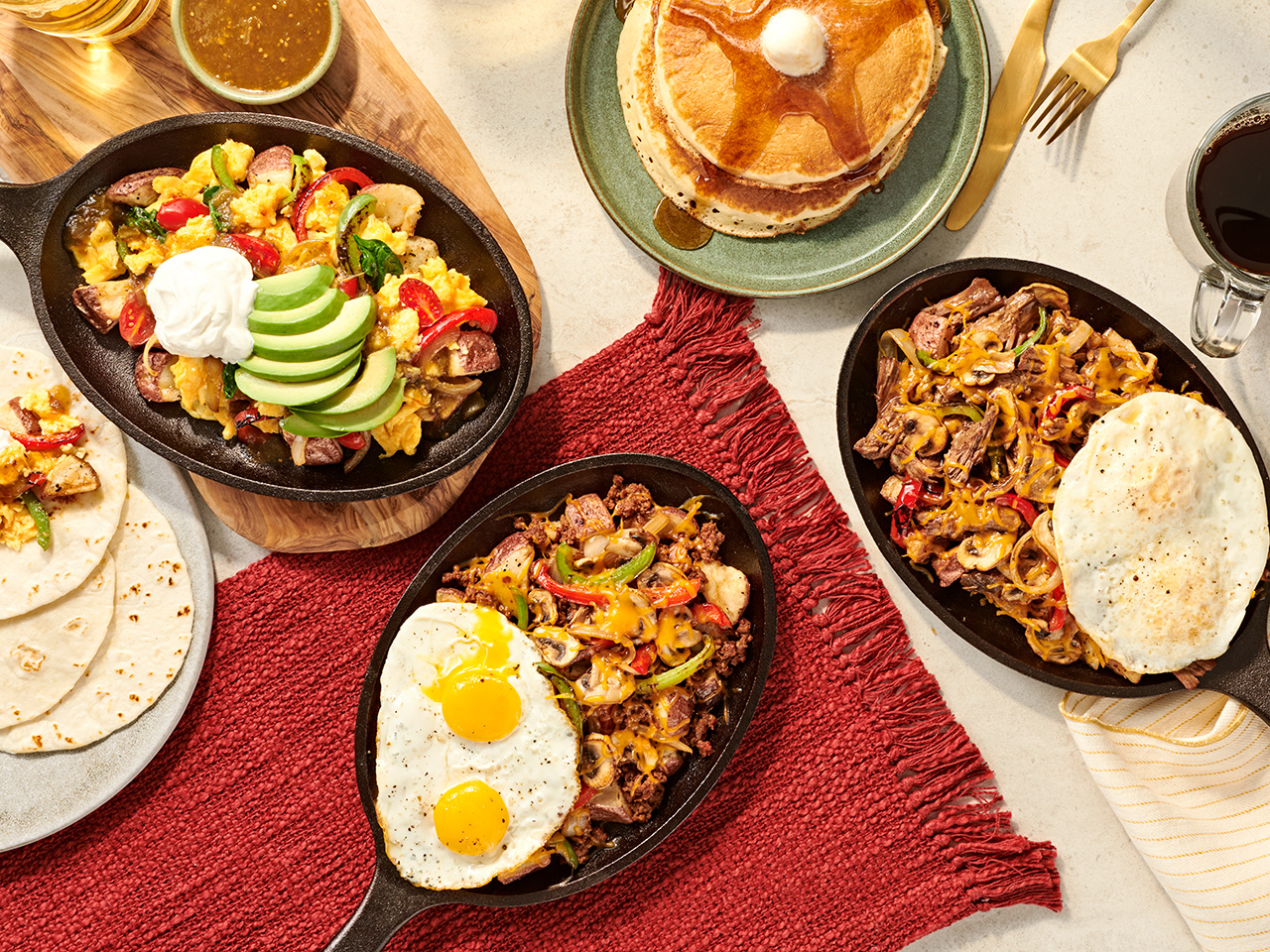 NEW Cali Taco Skillet: Bursting with freshness, this skillet features three eggs scrambled with fire-roasted bell peppers, onions, fresh grape tomatoes and spinach. It is served on a bed of crispy, red-skinned potatoes topped with salsa verde and finished with fresh avocado, sour cream and three warm flour tortillas. Plus it up by adding on chorizo for an extra kick of flavor.
